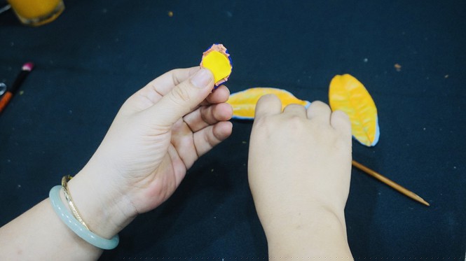 Tiếp đó, các nghệ nhân sẽ dùng keo sữa bôi bên ngoài để mướt lại phần thân, bước cuối cùng dùng thêm đất sét để tạo hiệu ứng màu.