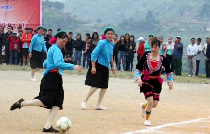 Một số hình ảnh của trận đấu đặc biệt mà các nữ cầu thủ trong trang phục dân tộc đầy màu sắc.