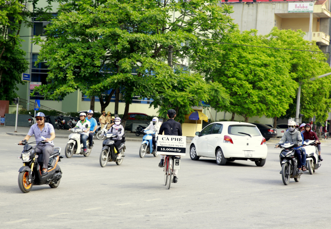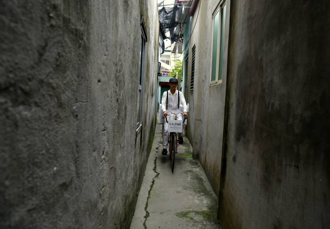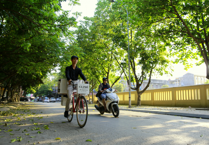 Một ngày của Quyết bắt đầu bằng việc dậy từ 5h để chuẩn cà phê. 7h anh bắt đầu rong ruổi khắp các trung tâm thành phố Thanh Hoá với chiếc xe đạp cà phê quen thuộc. Tôi đề nghị được đi theo anh đến những con đường quen thuộc, nơi có những người khách quen và cả những vị khách mới sắp sửa tình cờ gặp. Quyết đồng ý ngay.