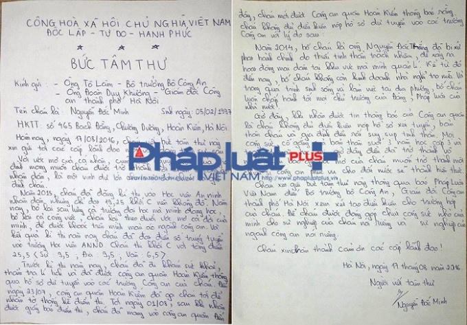 Thông qua tòa soạn Pháp Luật Plus, em Nguyễn Đắc Minh khẩn thiết gửi tâm thư này đến ông Tô Lâm, Bộ trưởng bộ Công an và ông Đoàn Duy Khương, Giám đốc Công an thành phố Hà Nội mong được xem xét, tạo điều kiện được vào học tại trường Công an như mơ ước.