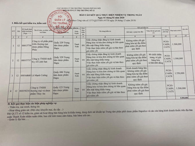Biên bản báo cáo kết quả kiểm tra của đội Quản lí thị trường số 12 tại Chợ thuốc Hapulico