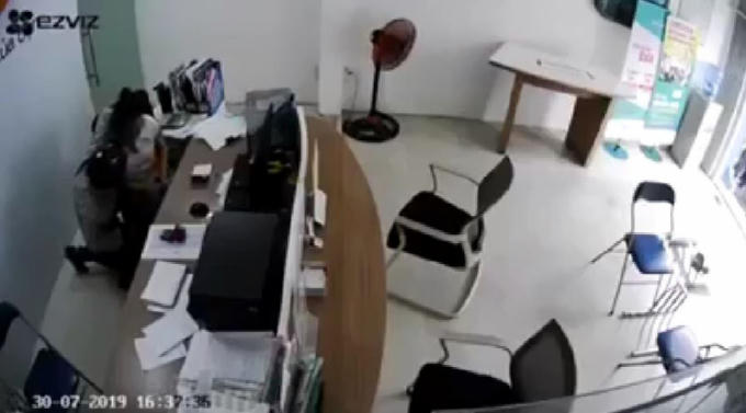 Trong lúc chị Phương làm thủ tục chuyển tiền, Tài đi vòng ra phía sau lưng, kề dao vào cổ uy hiếp, đe dọa để cướp tài sản.