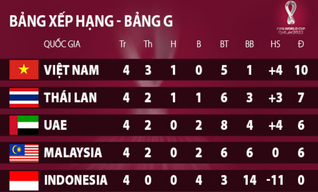 Với trận thua 1-2 trước Malaysia, đội tuyển Thái Lan vẫn chỉ có 7 điểm sau 4 lượt trận. Thầy trò HLV Akira Nishino đã để mất ngôi nhất bảng vào tay Việt Nam khi Tiến Linh và các đồng đội đã có chiến thắng trước tuyển UAE với tỷ số 1-0 ở trận đấu diễn ra tối cùng ngày.