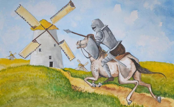 Họa hình Đôn Ki-hô-tê đánh cối xay gió.
