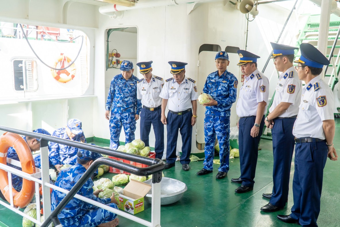 | Thủ trưởng Bộ Tư lệnh Vùng Cảnh sát biển 3 và các cơ quan chức năng kiểm tra công tác chuẩn bị của tàu CSB 8001 trước khi lên đường làm nhiệm vụ trực Tết. |