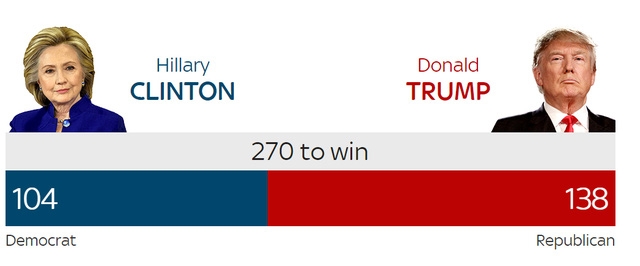 | Ông Trump tạm giành 138 phiếu đại cử tri, trong khi bà Clinton được 104 phiếu. (Nguồn: Sky News) |