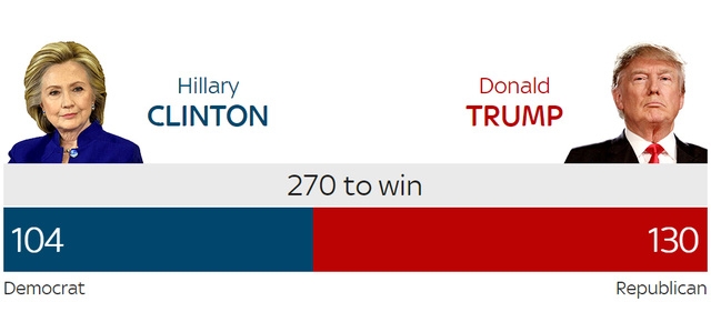 Theo Sky news, ông Trump đang giành 130 phiếu đại cử tri, trong khi bà Clinton giành 104.