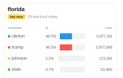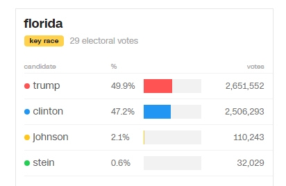 Kết quả kiểm 36% phiếu bầu tại Florida cho thấy, bà Clinton bất ngờ vọt lên dẫn trước ông Trump với tỷ lệ 49,2% và 48%. Trước đó, kết quả kiểm phiếu sơ bộ 1% phiếu bầu cho thấy ông Trump áp đảo với tỷ lệ 57,7%, bà Clinton chỉ giành 28,3%.
