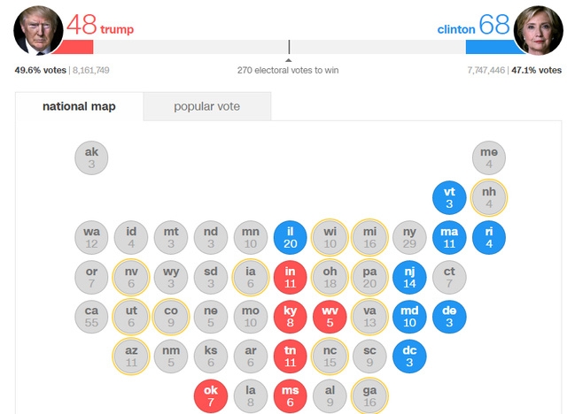 CNN cho rằng Clinton chắc thắng bang Virginia, có thêm 13 đại cử tri. Tổng cộng, Trump hiện thắng 19 bang, có 167 đại cử tri, Clinton thắng 12 bang, có 122 đại cử tri.