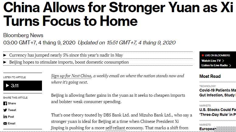 Đây là diễn biến mới, trái ngược hoàn toàn so với xu hướng giảm giá mạnh của đồng Nhân dân tệ chỉ vài tháng trước đó khi mà cuộc chiến Mỹ-Trung leo thang và Bắc Kinh muốn vực dậy nhanh nền kinh tế sau đại dịch Covid-19 bằng cách thúc đẩy xuất khẩu thông qua một đồng tiền trong nước đứng ở mức thấp.