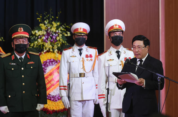 Đồng chí Phạm Bình Minh đọc lời điếu tại lễ truy điệu - Ảnh: VGP