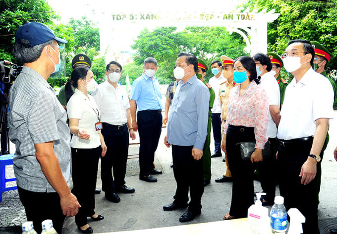 Bí thư Thành ủy Đinh Tiến Dũng và lãnh đạo TP Hà Nội kiểm tra công tác phòng, chống dịch tại phường Xuân Tảo (quận Bắc Từ Liêm). Ảnh: Viết Thành