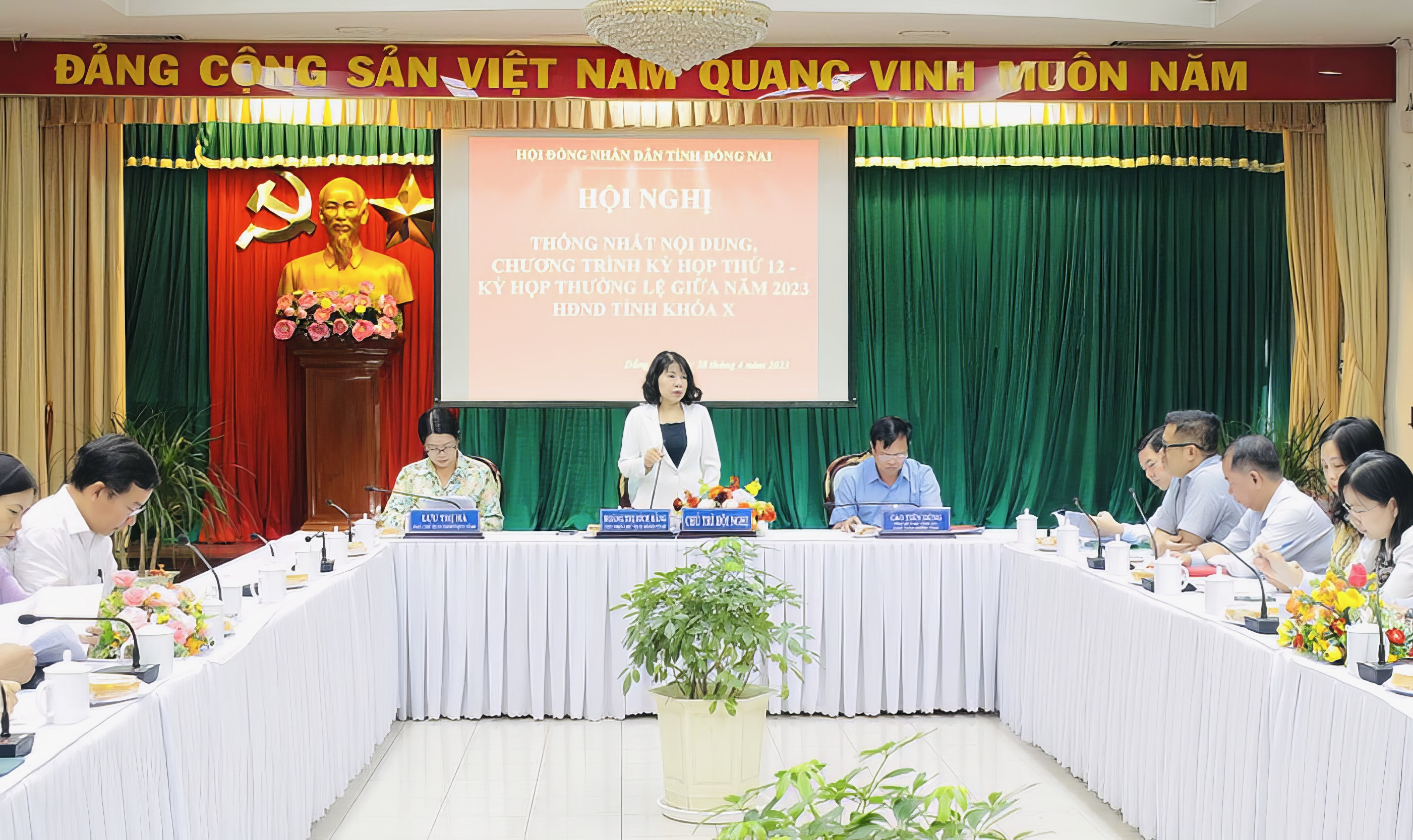 Phó chủ tịch HĐND tỉnh Hoàng Thị Bích Hằng phát biểu tại hội nghị thống nhất nội dung Kỳ họp thường lệ giữa năm 2023 của HĐND tỉnh. (Ảnh: BĐN)