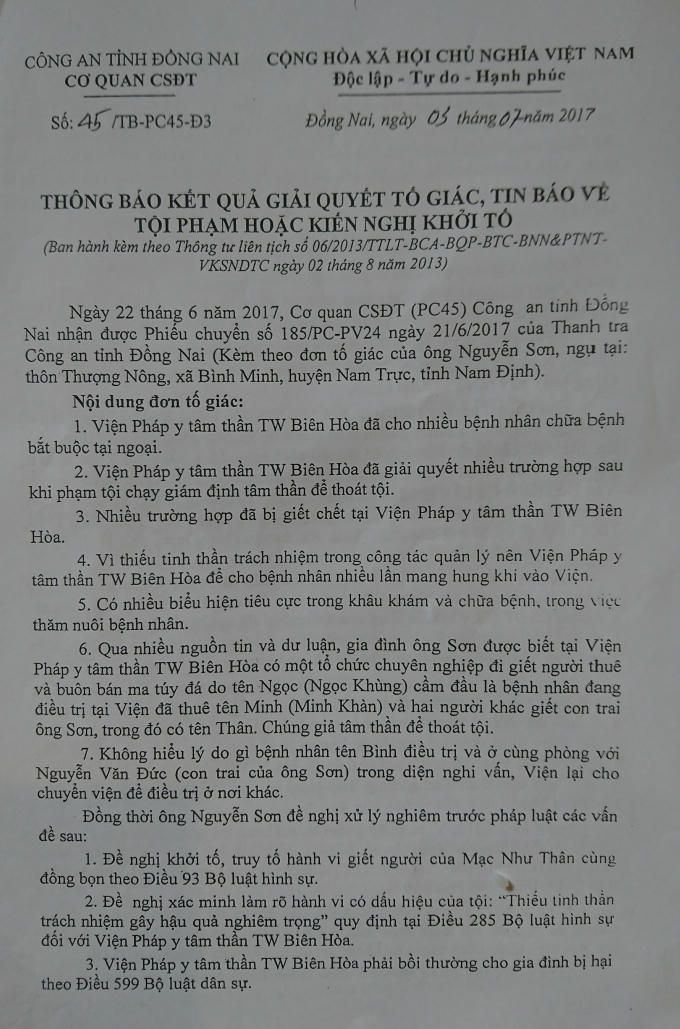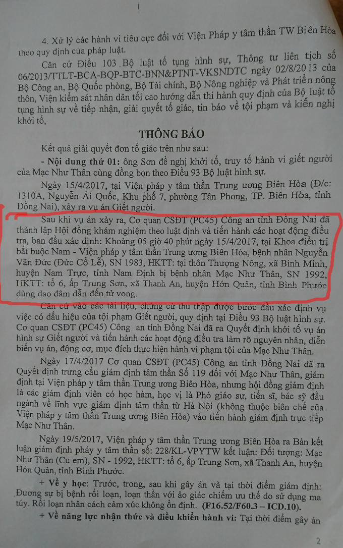 Căn cứ vào bản kết luận giám định ngày 19/5/2017 của Viện Pháp y tâm thần TƯ Biên Hòa, cơ quan CSĐT Công an tỉnh Đồng Nai đã ra quyết định khởi tố bị can đối với Mạc Đức Thân về tội "Giết người" theo quy định tại Điều 93- BLHS và đã được VKSND tỉnh Đồng Nai phê chuẩn.