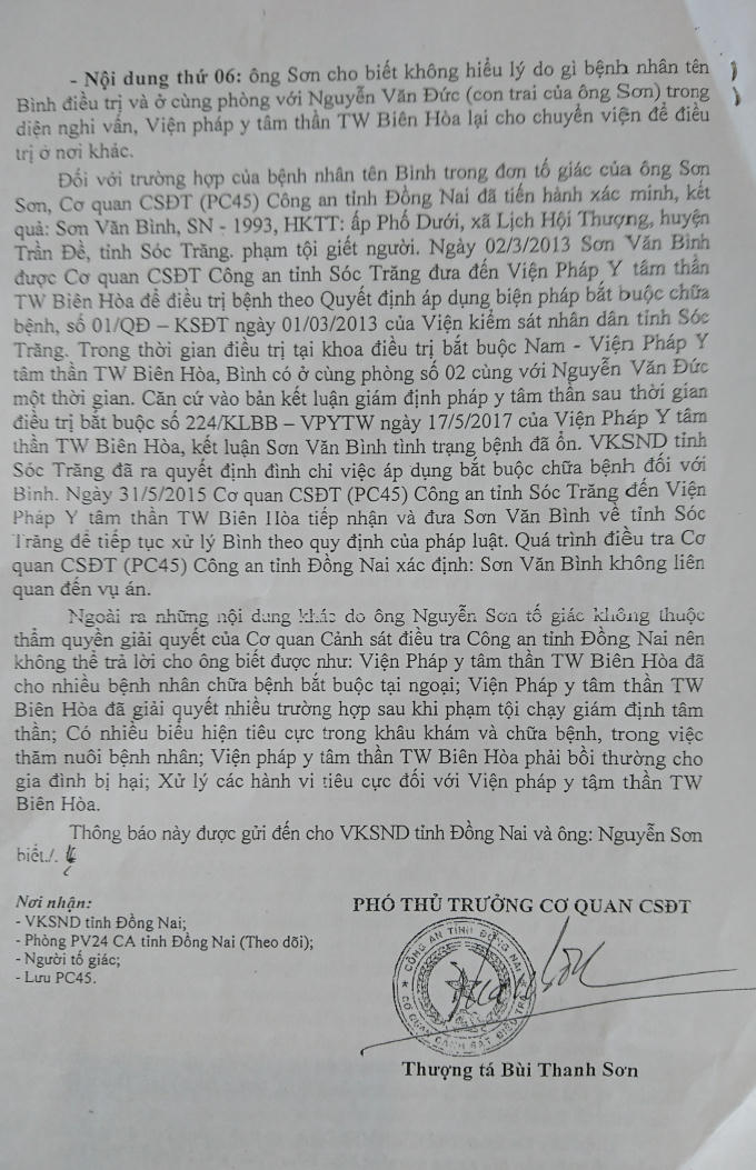 Theo thông tin từ cán bộ điều tra cho biết, Thượng tá Bùi Thanh Sơn - Phó thủ trưởng cơ quan CSĐT Công an tỉnh Đồng Nai đã có chỉ đạo điều tra làm rõ quy trình quản lý các bệnh nhân bị áp dụng biện pháp bắt buộc chữa bệnh đối với Viện Pháp y tâm thần TƯ Biên Hòa, nếu có dấu hiệu hình sự sẽ xử lý theo pháp luật.