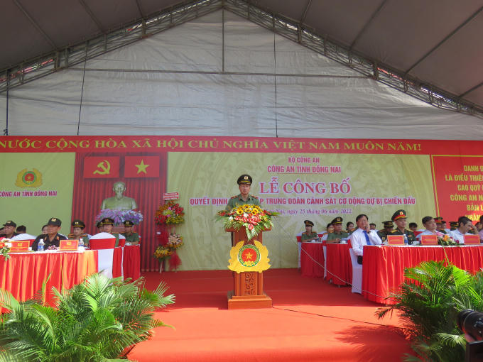 Đại diện Công an tỉnh Đồng Nai đã công bố Quyết định của Bộ trưởng Bộ Công an về việc thành lập Trung đoàn CSCĐ dự bị chiến đấu thuộc Công an tỉnh Đồng Nai; công bố Quyết định của Giám đốc Công an tỉnh về tổ chức bộ máy, phân công lãnh đạo Trung đoàn CSCĐ dự bị chiến đấu.