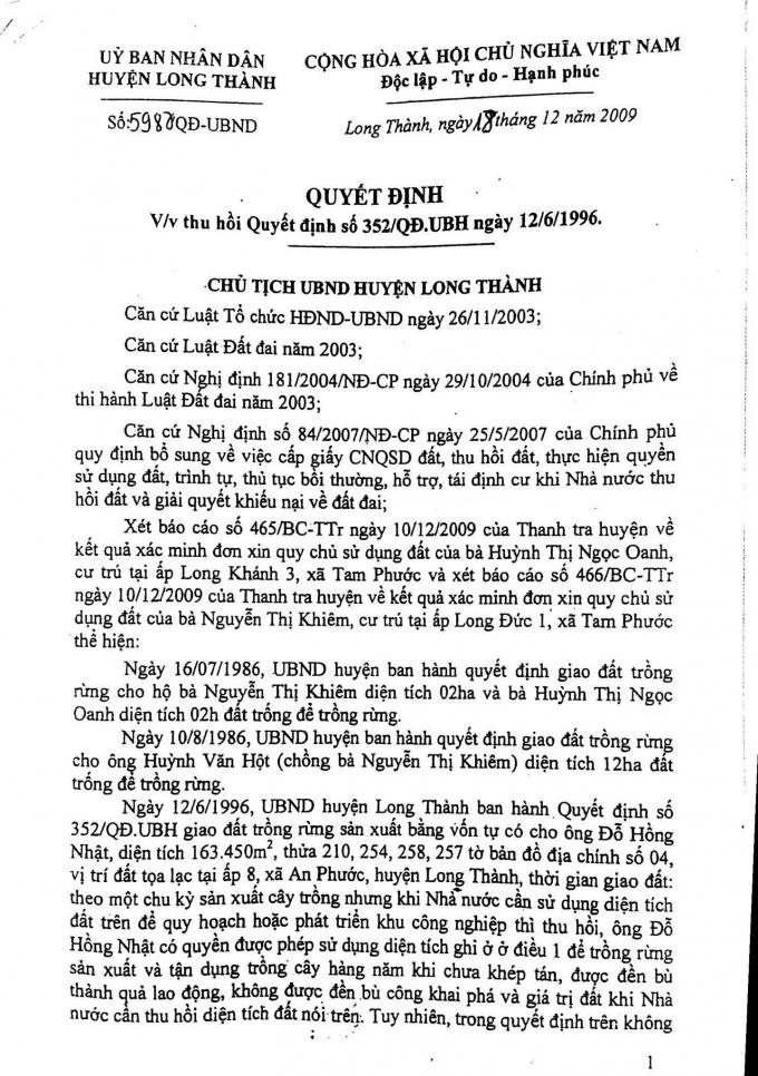 Ngày 12/6/1996, UBND huyện Long Thành ban hành quyết định số 352/QĐ.UBH giao đất trồng rừng sản xuất cho ông Đỗ Hồng Nhật trên diện tích đất trước đây đã được giao cho bà gia đình bà Oanh.