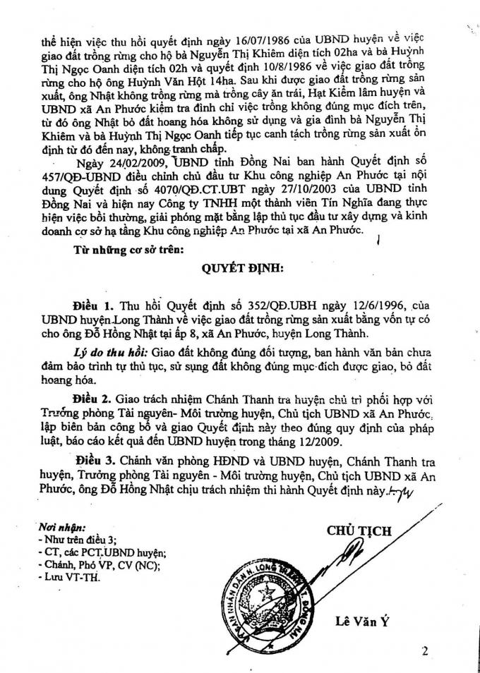 Ngày 12/6/1996, UBND huyện Long Thành ban hành quyết định số 352/QĐ.UBH giao đất trồng rừng sản xuất cho ông Đỗ Hồng Nhật trên diện tích đất trước đây đã được giao cho bà gia đình bà Oanh.