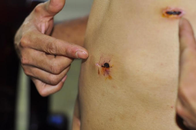 Theo tường trình của nạn nhân, anh bị trúng tổng cộng 4 phát đạn cao su. Trong đó 3 viên cắm vào vùng bụng, ngực trong khi viên còn lại trúng mông. Bị thương, Hưng cầm đá để phòng thủ nhưng sau đó anh này chạy trốn.