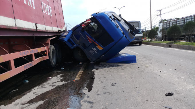 Khi qua khỏi ngã ba Bến Gỗ khoảng 1km thì tông vào đuôi xe container khác biển số 43C-060.53 đang dừng đậu sát dải phân cách để tài xế đi ăn cơm làm phương tiện này lao tới húc vào một xe tải khác cũng đang đậu phía trước.