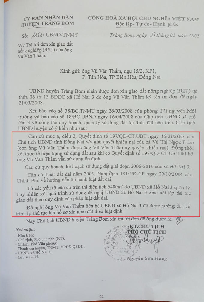 Ngày 12/5/2008, UBND huyện Trảng Bom (lúc này phần đất trên thuộc huyện Trảng Bom) có văn bản số 1152/UBND-TNMT trả lời Đơn xin giao đất nông nghiệp của ông Thấm. Theo đó, văn bản nêu rõ, xét Báo cáo của Phòng Tài nguyên - Môi trường và Báo cáo của Chủ tịch UBND xã Hố Nai 3 về công tác quy hoạch, quản lý sử dụng thửa đất nêu trên, Chủ tịch UBND huyện có ý kiến như sau: “Căn cứ mục a, điều 2, Quyết định số 197/QĐ-CT.UBT ngày 16/01/2003 của Chủ tịch UBND tỉnh Đồng Nai v/v giải quyết khiếu nại của bà Vũ Thị Ngọc Trâm (con ông Vũ Văn Thấm được ông Vũ Văn Thấm ủy quyền khiếu nại). Đồng thời xét thực tế hiện trạng sử dụng đất sau khi có 197/QĐ-CT.UBT thì hộ ông Vũ Văn Thấm vẫn sử dụng ổn định.