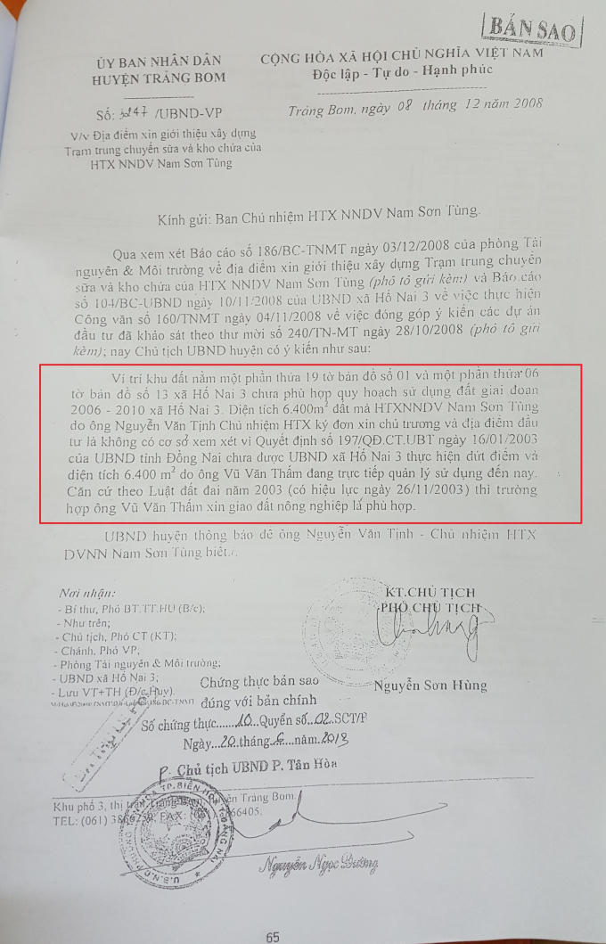 Văn bản trên nêu rõ, vị trí khu đất xin giới thiệu chưa phù hợp quy hoạch sử dụng đất giai đoạn 2006-2010 của xã Hố Nai 3. Trong đó, diện tích 6.400m2 đất mà HTX xin chủ trương và địa điểm đầu tư là “không có cơ sở xem xét vì Quyết định số 197/QĐ.CT.UBT ngày 16/01/2003 của UBND tỉnh Đồng Nai chưa được UBND xã Hố Nai 3 thực hiện dứt điểm và diện tích 6.400m2 do ông Vũ Văn Thấm đang trực tiếp quản lý sử dụng đến nay. Căn cứ theo Luật đất đai năm 2003 (có hiệu lực ngày 26/11/2003) thì trường hợp ông Vũ Văn Thấm xin giao đất nông nghiệp là phù hợp”.