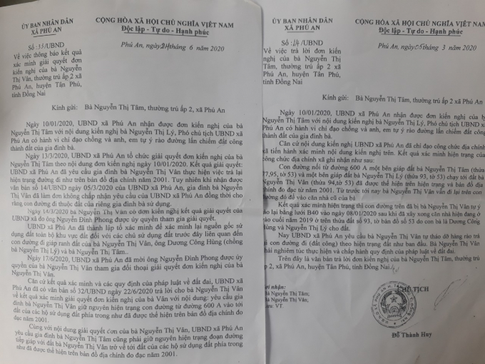 Gần 2 tháng sau, UBND xã Phú An mới có trả lời cho bà Tâm do ông Đỗ Thành Huy, Chủ tịch UBND xã ký. Trong nội dung trả lời bà Tâm, xã cho biết đã chỉ đạo cán bộ địa chính xác minh nội dung kiến nghị. Kết quả xác minh cho thấy, con đường trên đã bị bà Vân tự ý rào lại sau khi xây xong căn nhà trên đất của bà Lý (con gái) cho. UBND xã yêu cầu bà Vân phải tự tháo dỡ hàng rào, trả lại đường đi (đất công) theo hiện trạng như ban đầu theo bản đồ địa chính năm 2001.