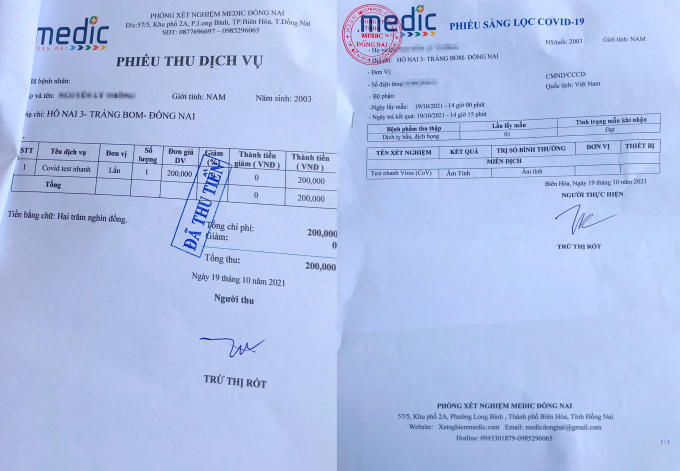 Tại đây, một người mặc đồ bảo hộ thực hiện thu tiền và lấy mẫu cho người sử dụng dịch vụ, sau khoảng 20 phút có kết quả xét nghiệm với con dấu của Phòng xét nghiệm MEDIC Đồng Nai có địa chỉ tại Phường Long Bình, TP Biên Hoà, địa chỉ này cách xa nơi đang lấy mẫu xét nghiệm khoảng 20km.