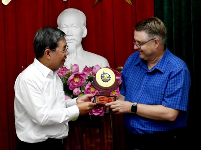 Phó chủ tịch UBND tỉnh Nguyễn Quốc Hùng tặng quà lưu niệm cho ông Troels Jakobsen, Tham tán thương mại Đại sứ quán Đan Mạch tại Việt Nam. (Ảnh: Cổng TTĐT ĐN)
