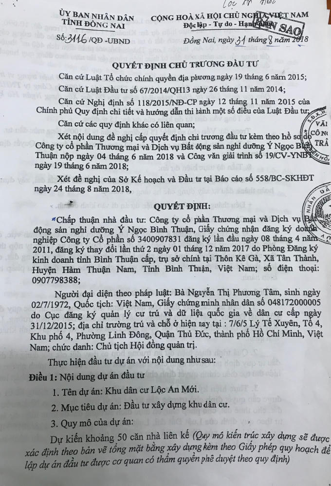 Theo tìm hiểu, dự án Khu dân cư Lộc An Mới (KDC Lộc An Mới) tọa lạc tại xã Lộc An, huyện Long Thành được UBND tỉnh Đồng Nai chấp thuận cho Công ty Cổ phần Thương mại và Dịch vụ Bất động sản Ý Ngọc Bình Thuận (Công ty Ý Ngọc Bình Thuận) làm chủ đầu tư theo Quyết định chủ trương đầu tư số 3116/QĐ-UBND ngày 31/8/2018.