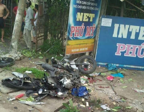 Tại hiện trường, chiếc xe tải mất lái lao vào tường rào nhà dân, chiếc xe máy bị vỡ vụn.