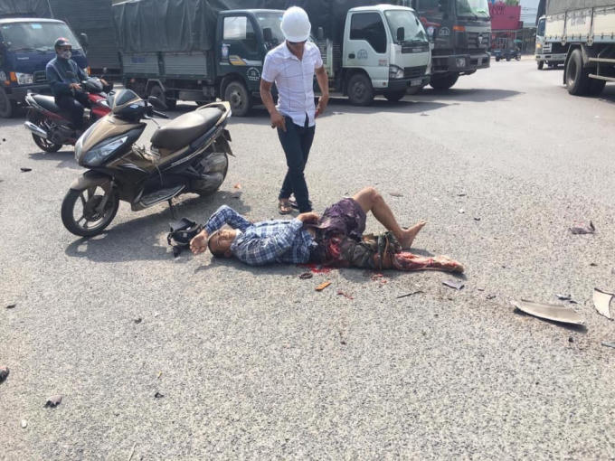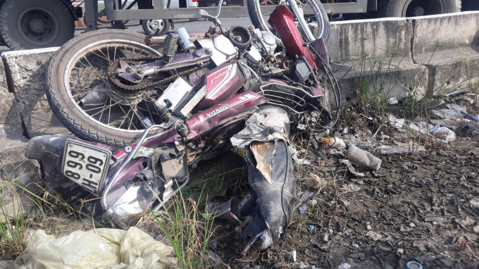 Vụ tai nạn khiến xe máy và người điều khiển bị cuốn vào gầm xe ben, xe máy bị bánh xe ben cán biến dạng nát phần tay cầm và đuôi xe, riêng anh Trần Quốc C, bị thương rất nặng phía dưới mông và chân bên phải do xe ben cán qua.
