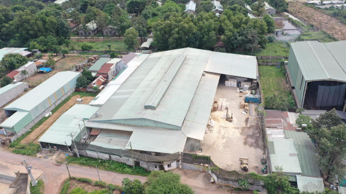 Xưởng ép mùn cưa, dăm bào nhìn từ trên cao.