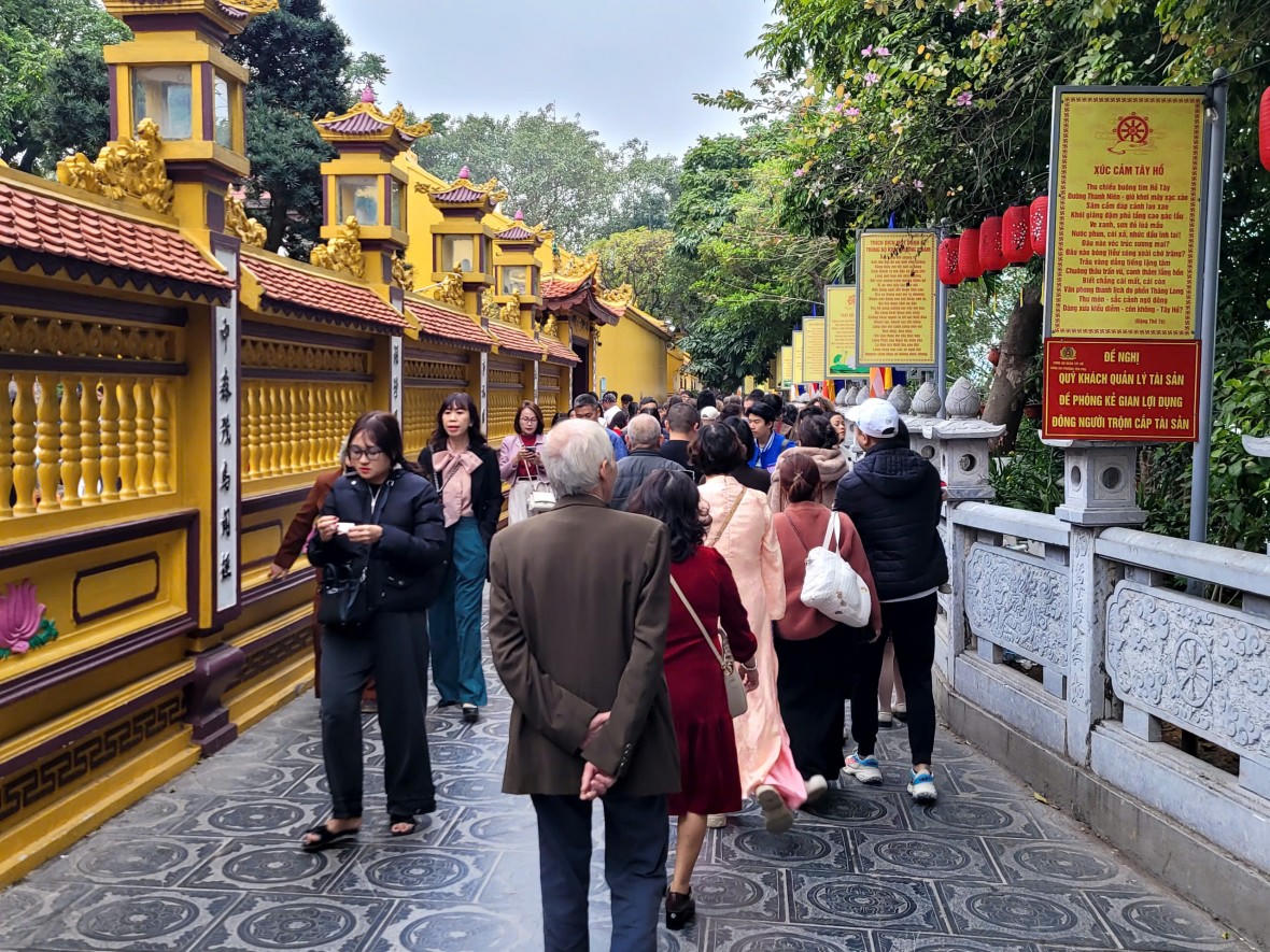 Phía bên trong, không gian dường như trở nên chật hẹp hơn bởi lượng du khách đổ về quá lớn. Tại khu vực chính điện và nhà thờ Tổ, khói hương nghi ngút hòa quyện cùng mùi thơm nhẹ nhàng của hoa tươi, tạo nên một bầu không khí đậm chất tâm linh.