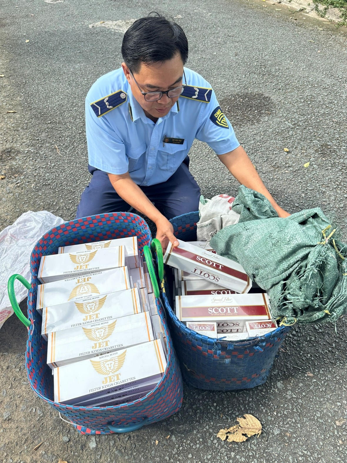 Qua khám, bên trong các giỏ xách có chứa 1.480 bao thuốc lá điếu nhập lậu nhãn hiệu Jet, Hero và Scott và không có người thừa nhận, đồng thời chưa xác định được chủ sở hữu, người quản lý hoặc người sử dụng hợp pháp tang vật.