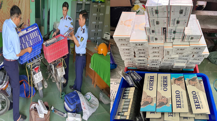 Tại thời điểm khám các thùng nhựa và túi xách trên 02 phương tiện lực lượng chức năng phát hiện trên phương tiện có vận chuyển 1.320 bao thuốc lá nhập lậu gồm các nhãn hiệu Jet, Hero và Nelson.