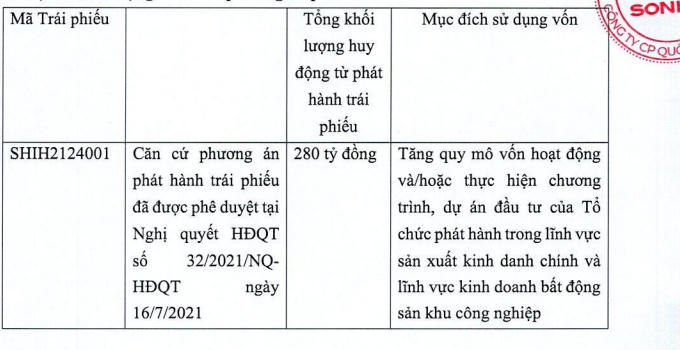 Được biết, lô trái phiếu có mã SHIH2124001 của Công ty CP Quốc tế Sơn Hà được phát hành có mục đích sử dụng vốn là tăng quy mô hoạt động và/hoặc thực hiện chương trình, dự án đầu tư của Tổ chức phát hành trong lĩnh vực sản xuất kinh doanh chính và lĩnh vực kinh doanh bất động sản khu công nghiệp.
