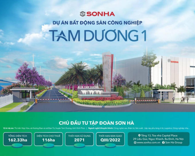 Được biết, vào tháng 3/2021, Phó Thủ tướng Chính phủ Trịnh Đình Dũng đã ký quyết định chủ trương đầu tư Dự án đầu tư xây dựng và kinh doanh hạ tầng kỹ thuật KCN Tam Dương I - Khu vực 2, huyện Tam Dương với tổng vốn đầu tư hơn 1.316 tỷ đồng, nhà đầu tư là Công ty Cổ phần Quốc tế Sơn Hà.