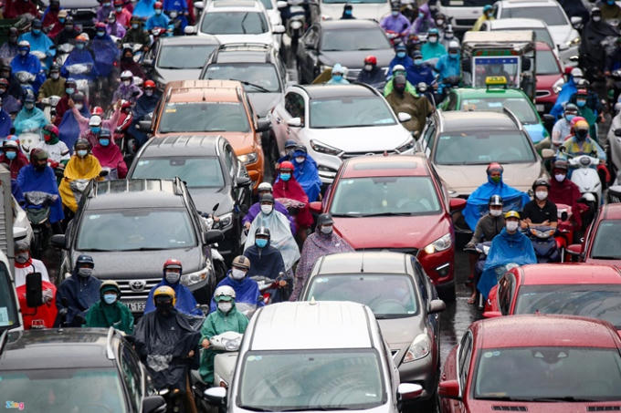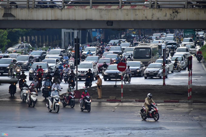 Lúc 7h10, phương tiện di chuyển ngã tư Phạm Hùng - đại lộ Thăng Long cũng đông đúc. Ảnh: Nhật Sinh.