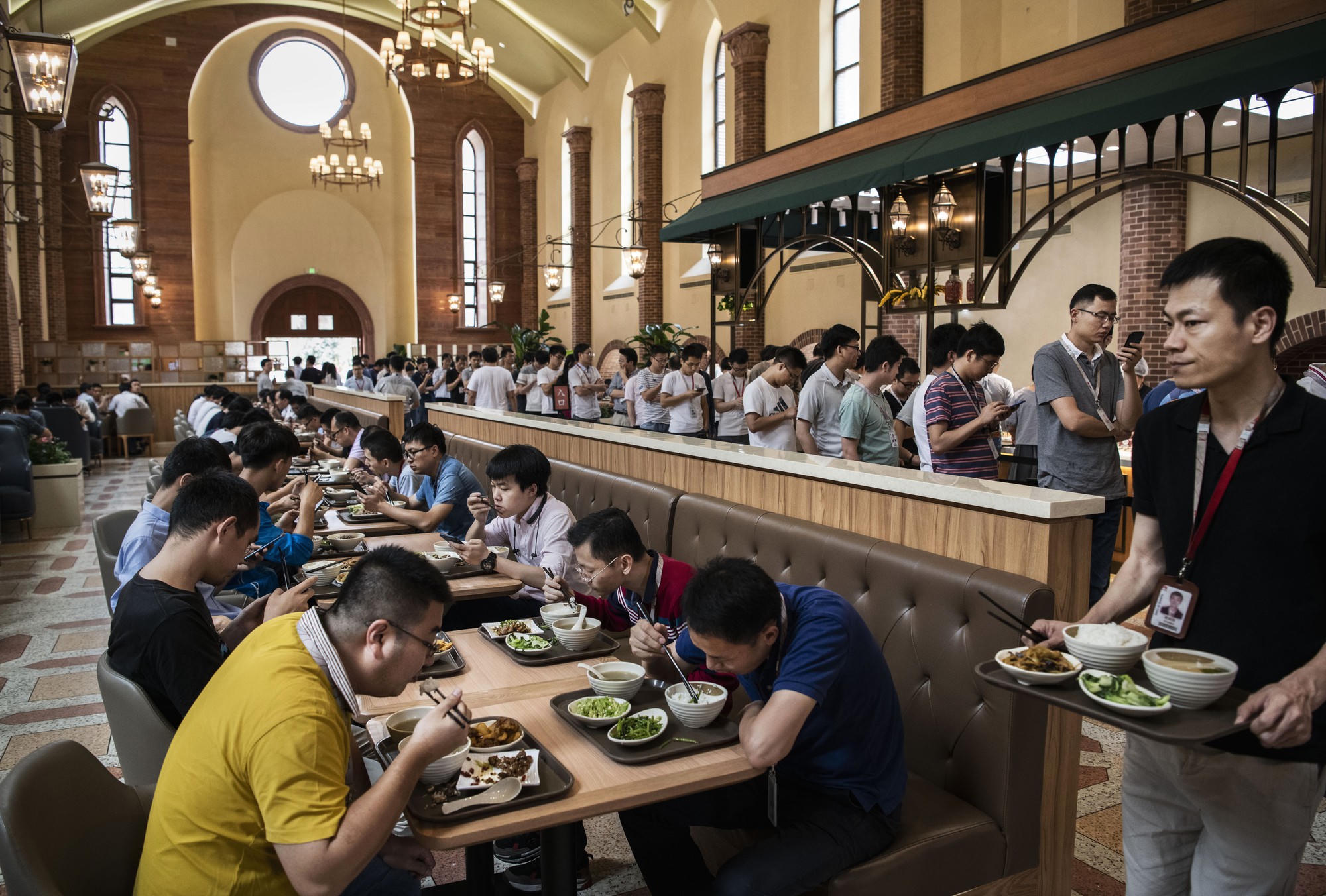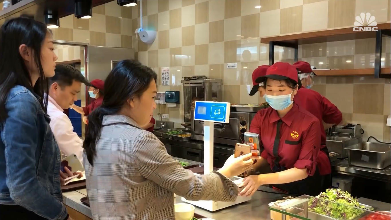 Nhân viên Huawei thanh toán cho bữa ăn của mình bằng điện thoại, không dùng tiền mặt. Ảnh: CNBC.