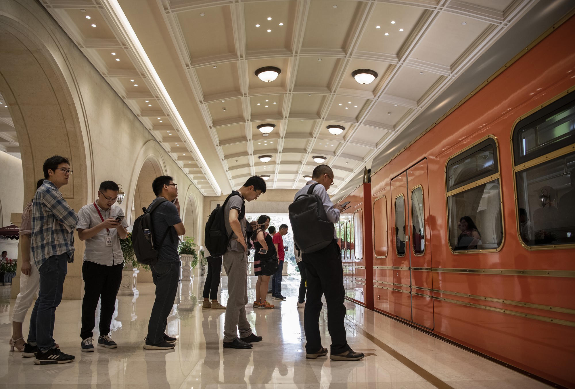 Nhân viên Huawei chuẩn bị lên tàu điện để di chuyển trong khu Ox Horn. Ảnh: Getty Images.