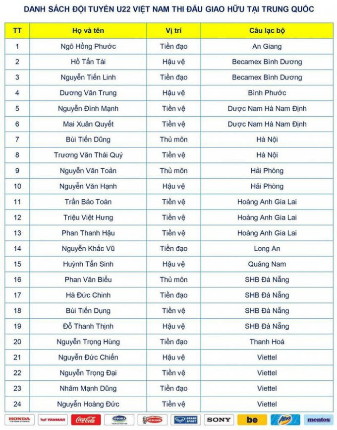 Danh sách cầu thủ U22 thi đấu giao hữu với U22 Trung Quốc