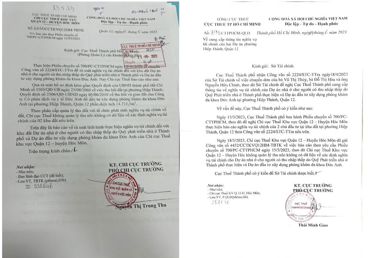 Ngày 18/5/2023, Cục thuế Thành phố có văn bản số 4432/CCTKVQ12HM-TBTK, về việc báo cáo theo phiếu chuyển số 700/PC-CTTPHCM ngày 15/5/2023 của Cục thuế Quận 12 Hóc Môn gửi Cục thuế thành phố HCM có nội dung: thực hiện phiếu chuyển số 700/PC-CTTPHCM ngày 15/5/2023 về chuyển Công văn số 2224/STC-TTr để rà soát nghĩa vụ tài chính đối với khu đất Dự án nhà ở cho người có thu nhập thấp do Quỹ phát triển nhà ở thành phố và Dự án đầu tư xây dựng Phòng khám đa khoa Đức Anh…: