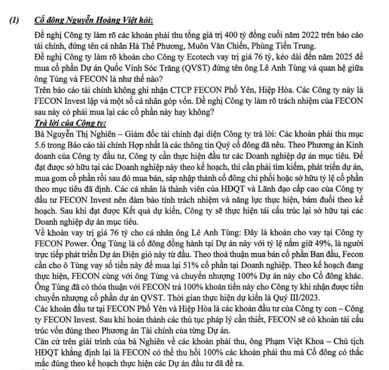 Cổ đông FCN chất vấn ban lãnh đạo tại buổi Họp ĐHCĐ diễn ra tháng 4/2023. Trong đó, nhiều nội dung xoay quanh khoản phải thu hàng trăm tỷ đồng, cùng với tiến độ triển khai dự án tại Bắc Giang, Thái Nguyên.