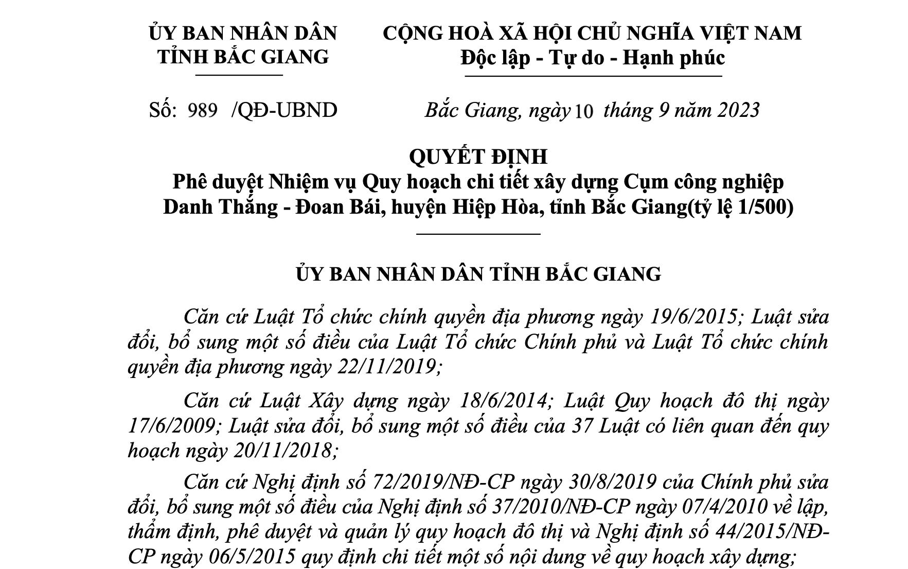 Đáng chú ý, ngày 10/9/2023, UBND tỉnh Bắc Giang đã ban hành Quyết định phê duyệt nhiệm vụ Quy hoạch chi tiết xây dựng Cụm công nghiệp Danh Thắng - Đoan Bái, huyện Hiệp Hòa, tỉnh Bắc Giang (tỷ lệ 1/500).