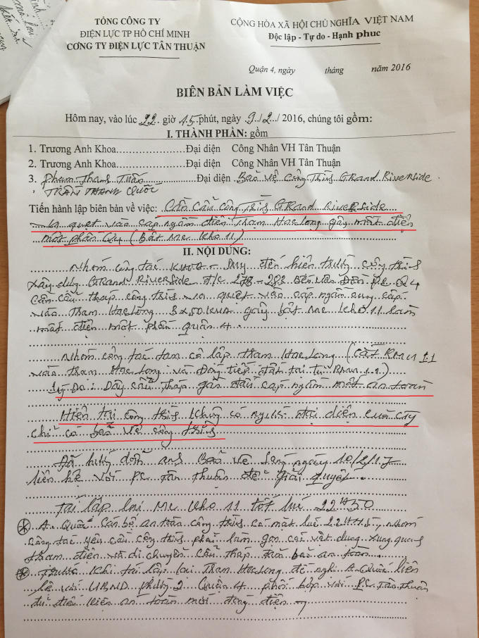Cụ thể, biên bản được lập vào 22h15, đêm 9/2, có ông Trương Anh Khoa (đại diện phía Công ty Điện lực Tân Thuận), và các ông Phạm Thanh Tuấn, Trần Thanh Quốc (bảo vệ công trình Grand Riverside). Nội dung lập biên bản về việc: “Cần cẩu công trình Grand Riverside va quẹt vào cáp ngầm điện trạm HacLong, gây mất điện một phần quận 4”.