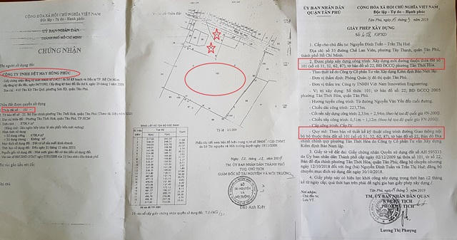 Cụ thể, theo Giấy phép xây dựng số 408/GPXD do UBND quận Tân Phú cấp ngày 15/3/2019 cho ông Nguyễn Đình Tuấn có ghi rõ trong mục 3: "Giấy tờ về đất đai” là Giấy chứng nhận quyền sử đụng đất AH 595333 do UBND TP HCM cấp ngày 2/12/2009 tại thửa số 101, tờ số 22, Bản đồ địa chính phường Tân Thới Hòa. Tuy nhiên, về quy mô lại ghi được phép xây dựng cả lên thửa đất số 31 và 32. Cụ thể, theo giấy phép trên: “Quy mô: Theo bản vẽ thiết kế kỹ thuật công trình đường Giao thông nội bộ thuộc thửa đất số 101 (số cũ 31, 32, 62, 87), tờ bản đồ số 22, Bản đồ địa chính chính quy phường Tân Thới Hòa”.