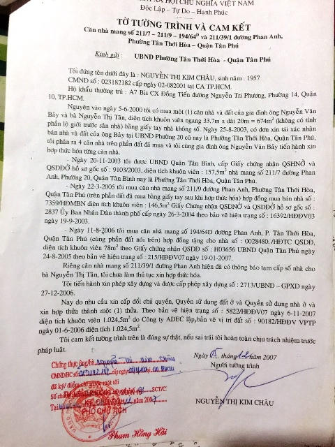 Theo hồ sơ thể hiện, ngày 7/6/2000, bà Châu đã nhận chuyển nhượng bằng hợp đồng giấy tay một khu đất trên đường Nguyễn Văn Yến, phường Tân Thới Hòa, quận Tân Phú (trước đây là đường Phan Anh, quận Tân Bình) của vợ chồng ông Nguyễn Văn Bảy và bà Nguyễn Thị Tâm, với tổng diện tích 2.300 m2 (thuộc các thửa số 28, 29, 30, 31, 32, tờ bản đồ số 22). Toàn bộ phần diện tích này đã được UBND quận Tân Bình cấp Giấy chứng nhận tạm thời quyền sử dụng ruộng đất số 904/UB-CNRĐ ngày 12/9/1988 cho ông Nguyễn Văn Bảy.