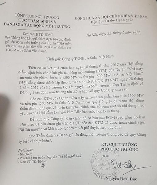 Trước đó, ngày 22/6/2017, Cục thẩm định và đánh giá tác động môi trường đã có Công văn số 74/TBTĐ-ĐMC do ông Nguyễn Hoài Đức - Phó cục trưởng ký gửi Công ty TNHH Ja Solar Việt Nam cho biết: Báo cáo ĐTM của dự án của Công ty Ja Solar đã được Hội đồng thẩm định thông qua với điều kiện phải chỉnh sửa, bổ sung một số nội dung theo yêu cầu của hội đồng. Từ đó, Cục Thẩm định và đánh giá tác động môi trường đề nghị Công ty Ja Solar Việt Nam hoàn chỉnh hồ sơ báo cáo ĐTM gửi Bộ TN&MT để xem xét, phê duyệt theo quy định.