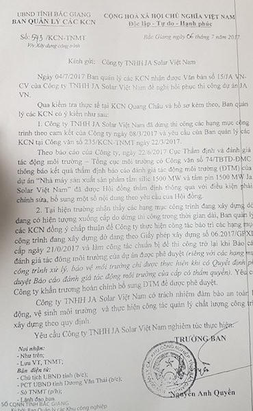 Cụ thể, Công văn số 543/KCN-TNMT do ông Nguyễn Anh Quyền ký ngày 6/7/2017 cho biết: “Theo báo cáo của công ty, ngày 22/6/2017, Cục Thẩm định và đánh giá tác động môi trường (Tổng cục môi trường) có Công văn số 74/TBTĐ - ĐMC thông báo kết quả thẩm định báo cáo đánh giá tác động môi trường (ĐTM) của dự án “Nhà máy sản xuất tấm silic 1500 MW và tấm pin 1500 MW Ja Solar Việt Nam” đã được Hội đồng thẩm định thông qua với điều kiện phải chỉnh sửa, bổ sung một số nội dung theo yêu cầu của hội đồng”. Ban quản lý các khu công nghiệp tỉnh Bắc Giang đã căn cứ vào nội dung này để ra văn bản cho phép chủ đầu tư bảo trì các công trình. Và chủ đầu tư thì cho công nhân tiếp tục thi công dự án.